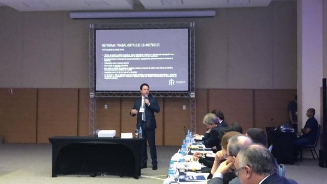 Após apresentação dos representantes das entidades de TI de todos os estados, foi proferida a primeira palestra com o tema ‘Reforma trabalhista/terceirização’, do advogado Eduardo Torres Roberti. Durante sua palestra, ele tratou sobre o gênero de espécie de trabalho à distância, onde o empregado trabalha sem a necessária permanência no estabelecimento da empresa. Diante desta premissa, ele ressalta o exercício do trabalho mediante recursos telemáticos, ou seja, de equipamentos portáteis dotados de hardware e software. Em seguida, Eduardo Torres abordou as novas regras de terceirização, da Lei nº 13.429/2017, para empresas públicas e privadas e, consequentemente, suas responsabilidades.