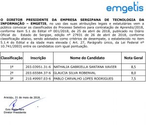 A Emgetis convoca os três primeiros classificados no Processo Seletivo Aprendiz 2018, realizado no último dia 14 de maio, na sede da Empresa.